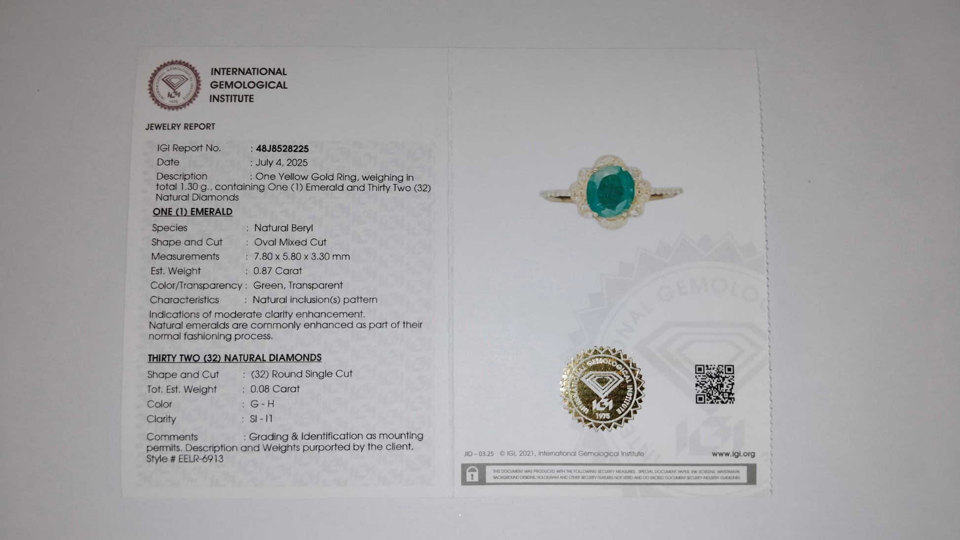 - Lab Name: International Gemological Institute (IGI)