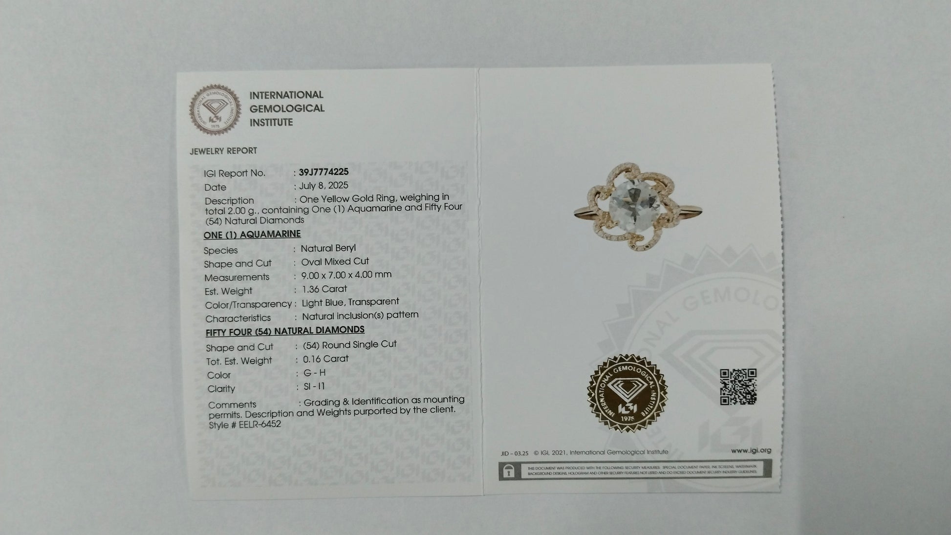 - Lab Name: International Gemological Institute (IGI)
