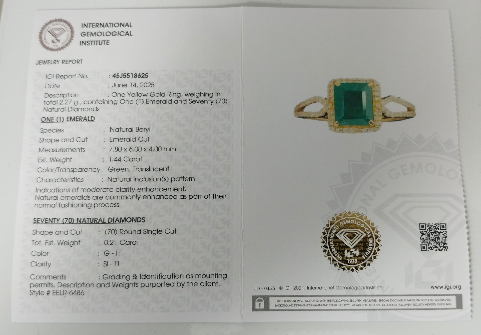 - Lab Name: International Gemological Institute (IGI)