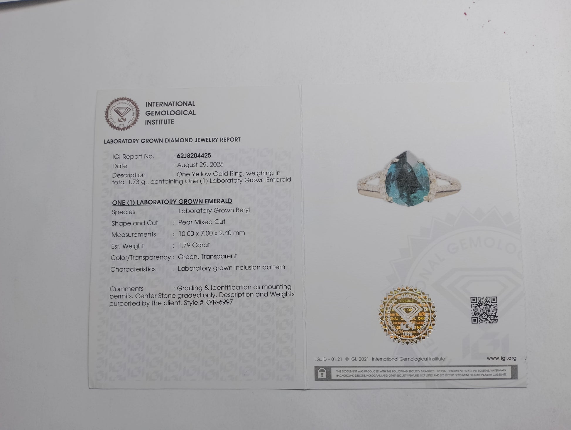 1.89 Ct Pear Mixed Cut Lab Grown Emerald 14K Gold Ring