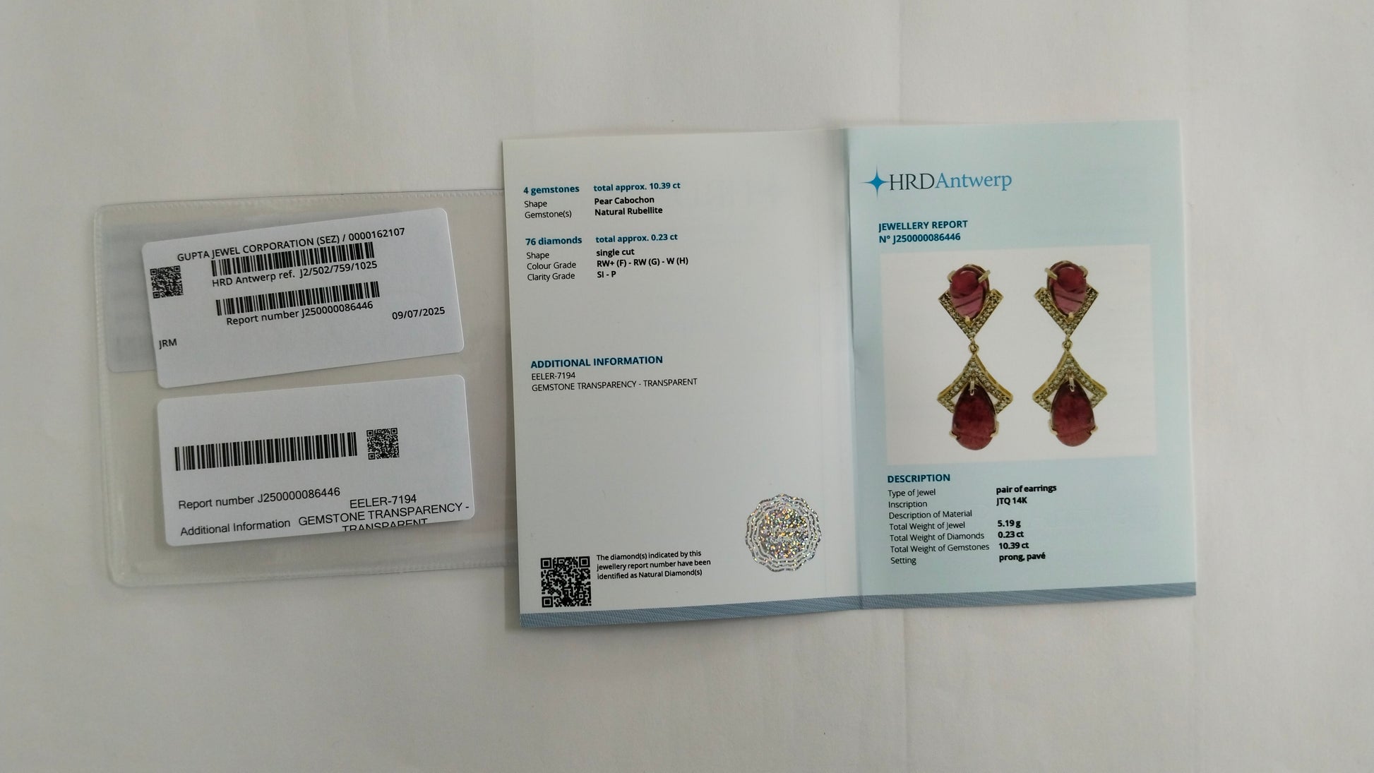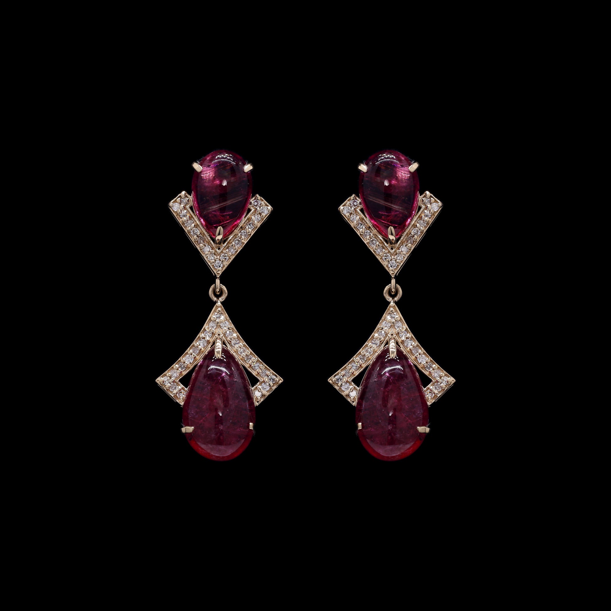 10.62 Ct Pear Cabochon Natural Rubellite 14K Gold Earrings
