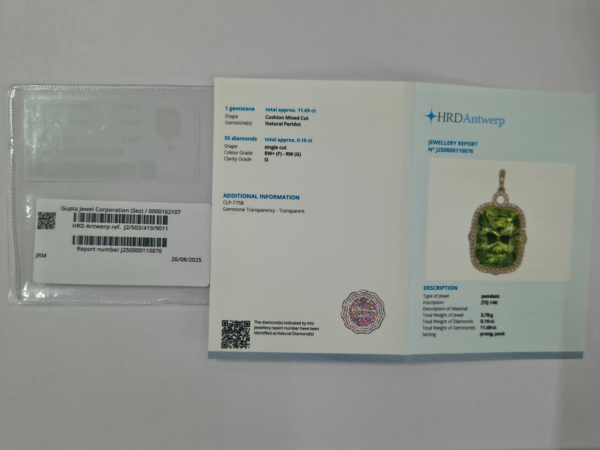 11.85 Ct Cushion Mixed Cut Natural Peridot 14K Gold Pendant