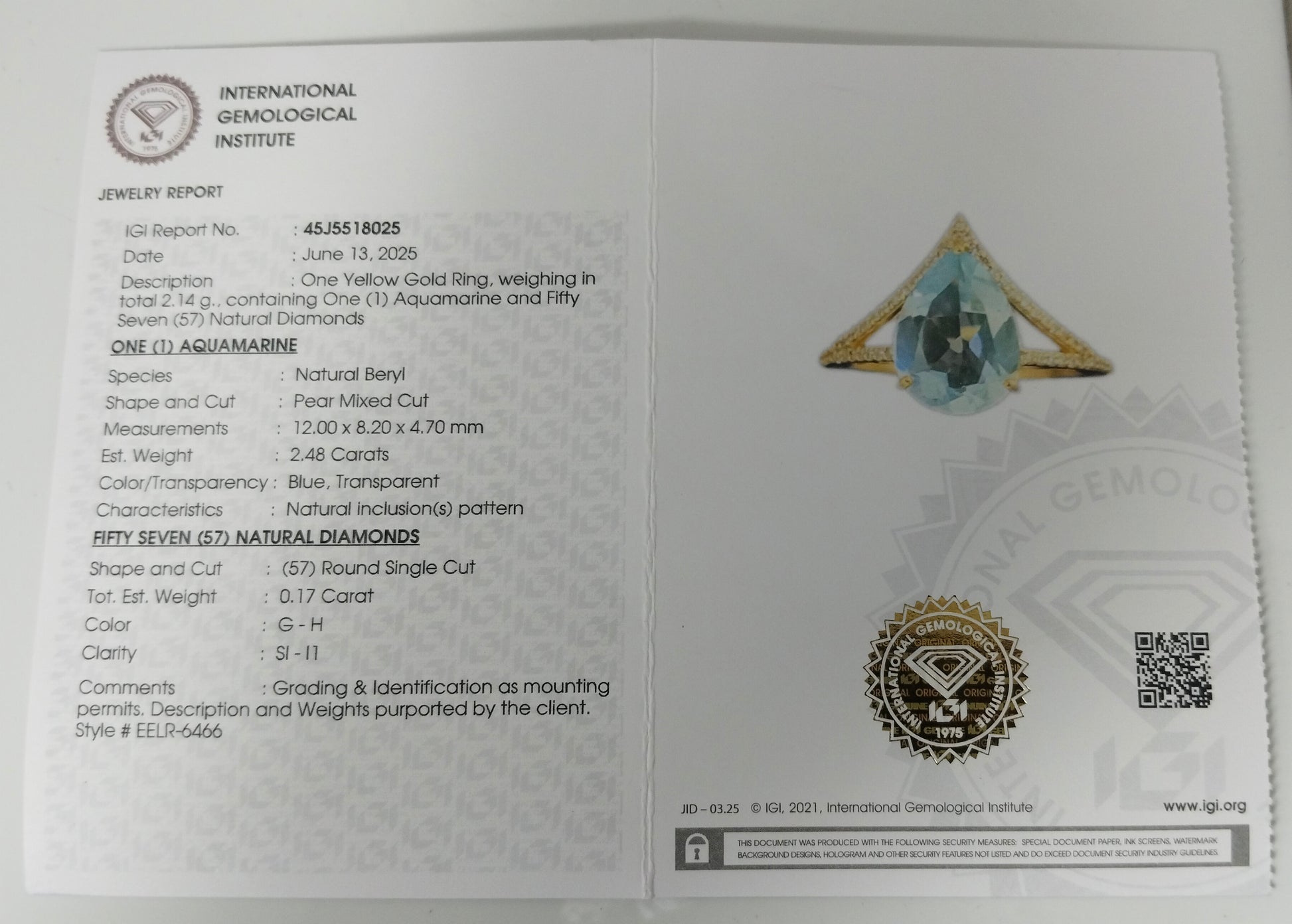 - Lab Name: International Gemological Institute (IGI)