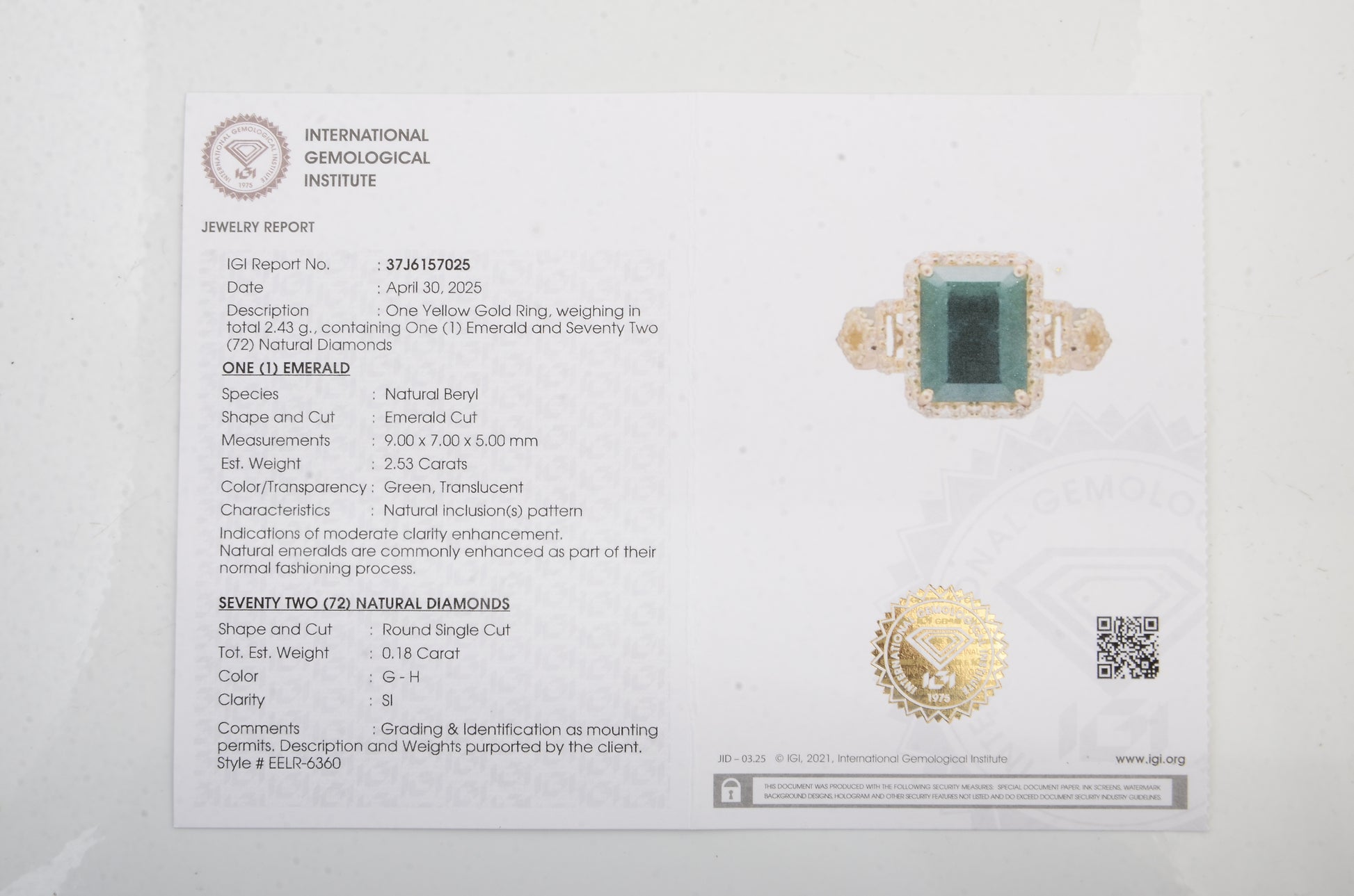 - Lab Name: International Gemological Institute (IGI)