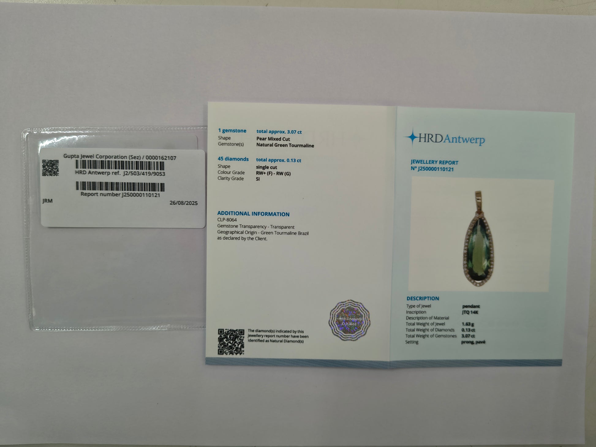 3.20 Ct Pear Mixed Cut Natural Tourmaline 14K Gold Pendant