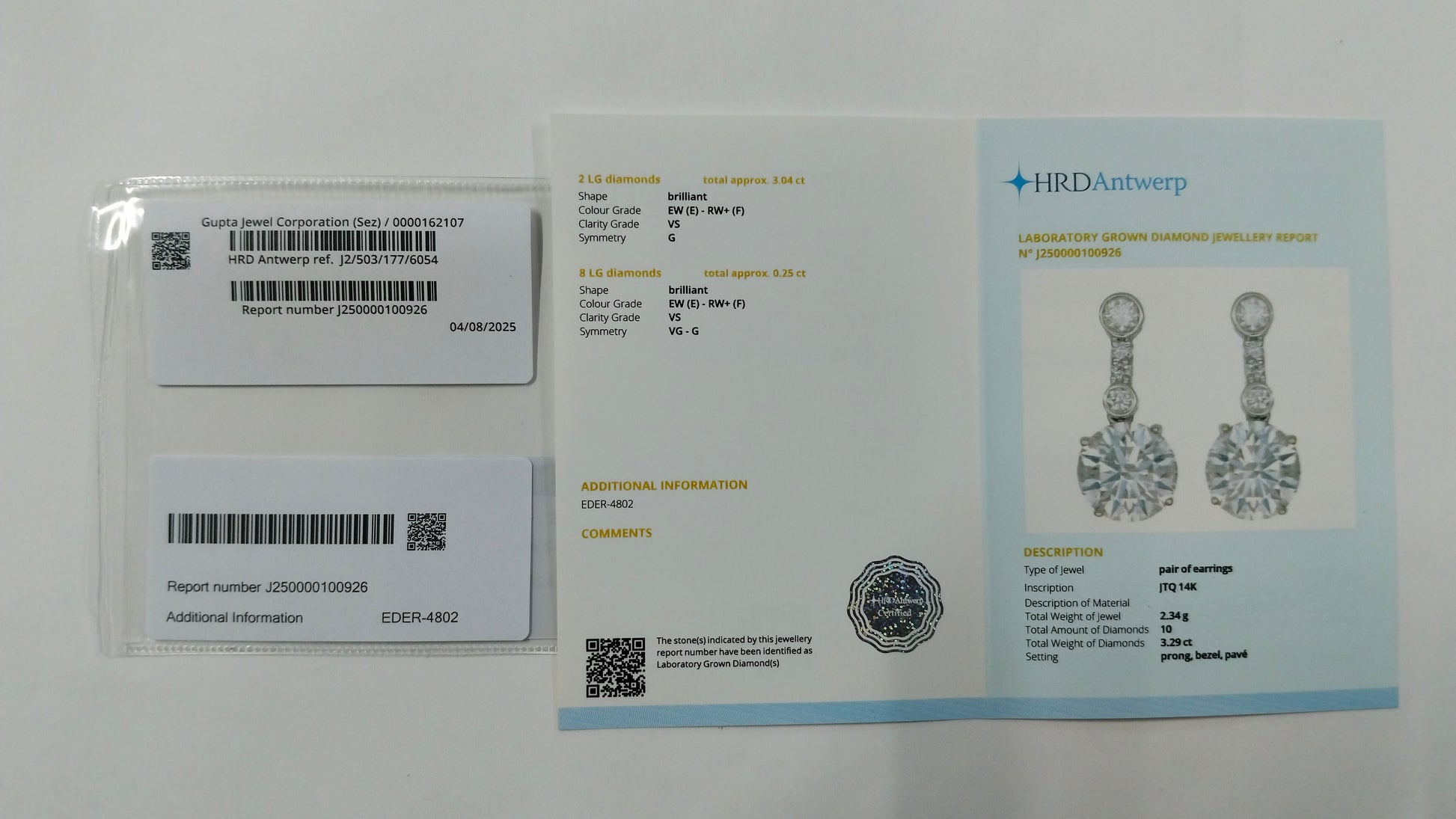3.29-Carat Lab-Grown Diamond Round Cut Brilliant Earrings ? HRD Certified