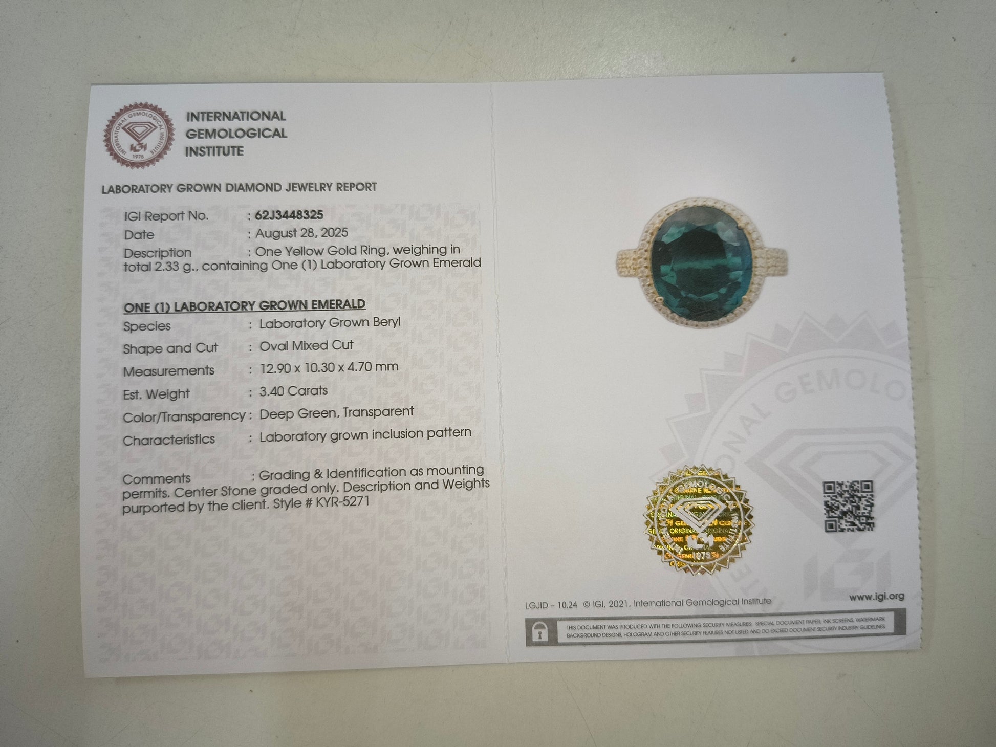 - Lab Name: International Gemological Institute (IGI)