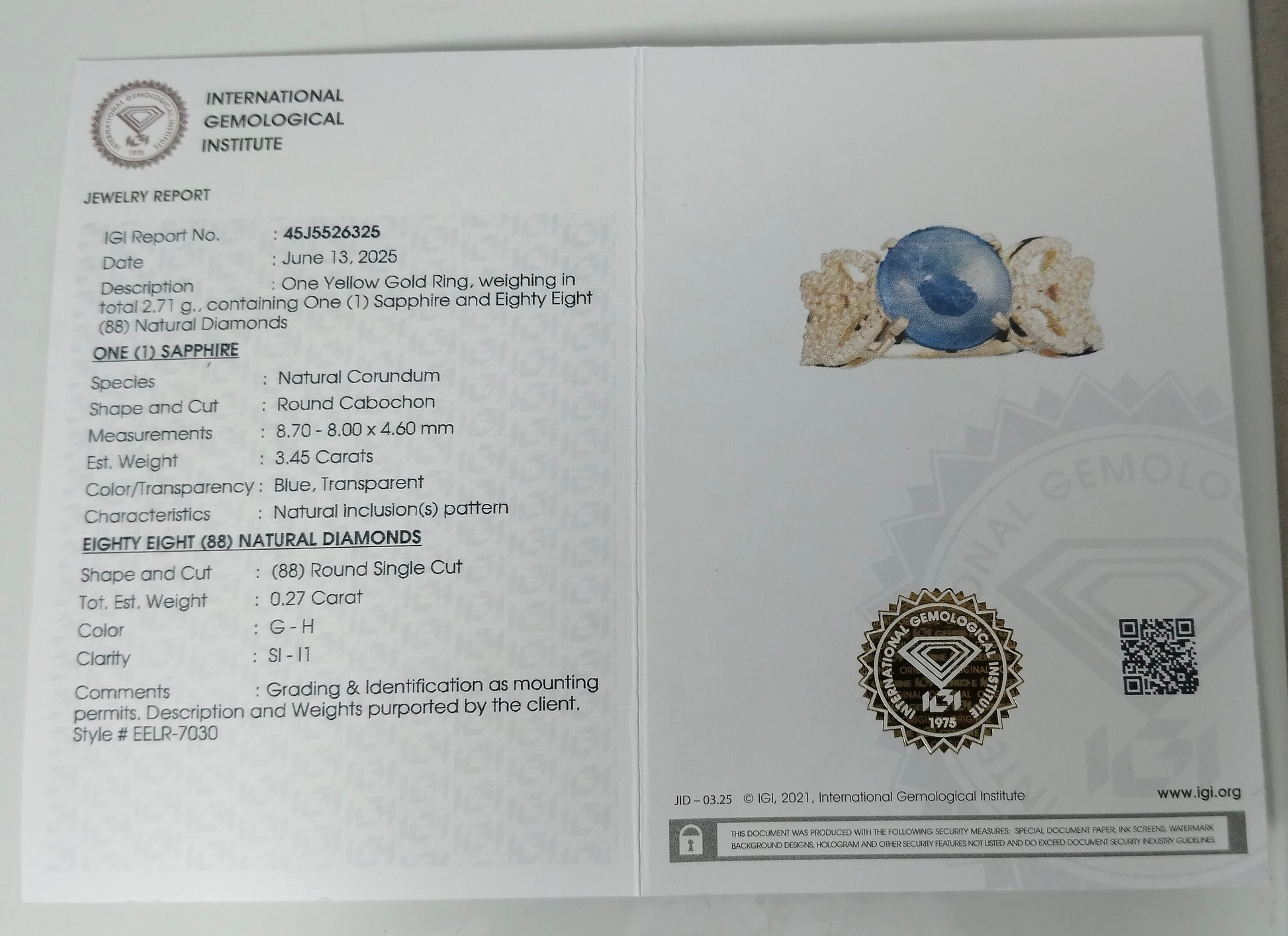 - Lab Name: International Gemological Institute (IGI)
