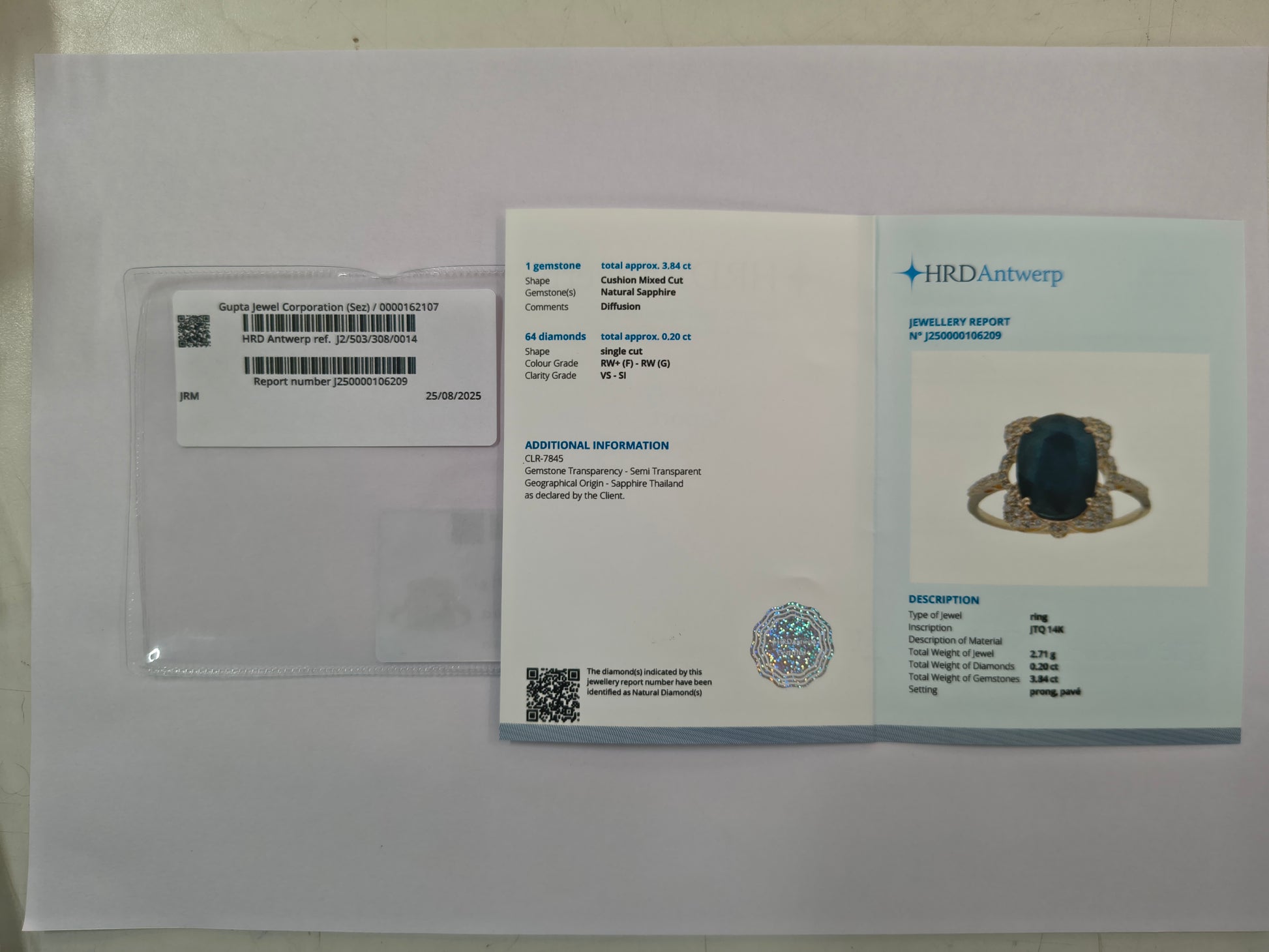 4.04 Ct Cushion Mixed Cut Natural Sapphire 14K Gold Ring