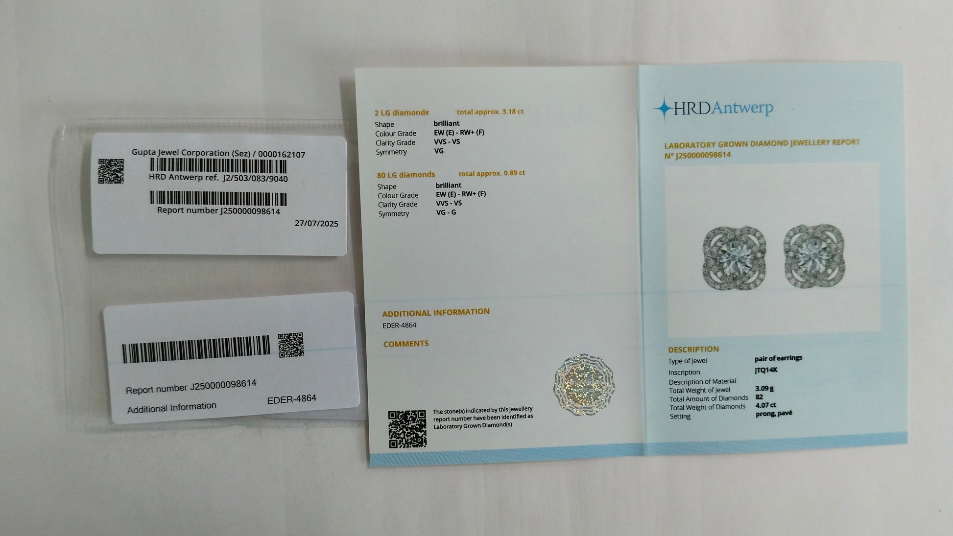 4.07-Carat Lab-Grown Diamond Round Cut Brilliant Earrings ? HRD Certified
