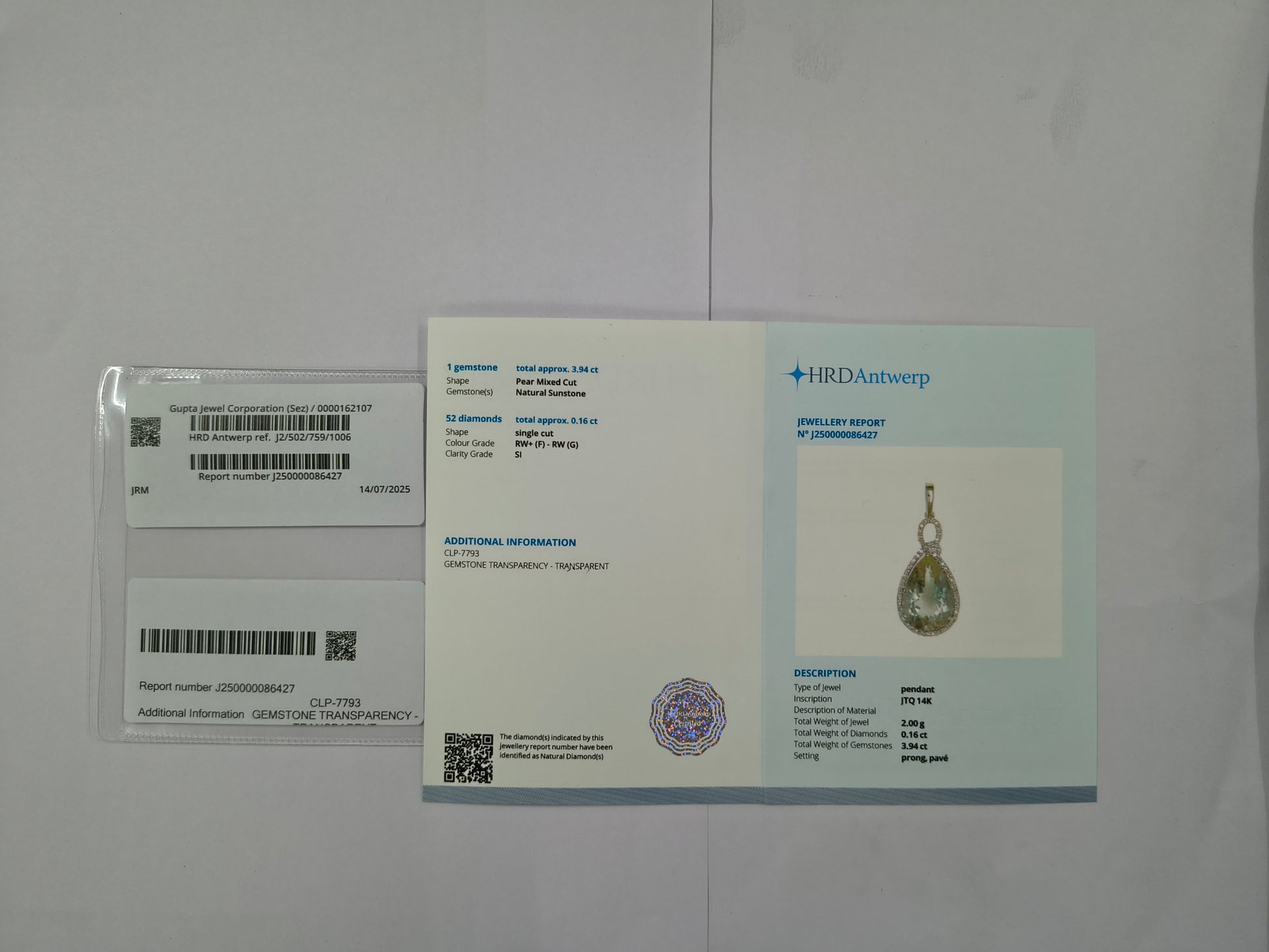 4.10 Ct Pear Mixed Cut Natural Sunstone 14K Gold Pendant