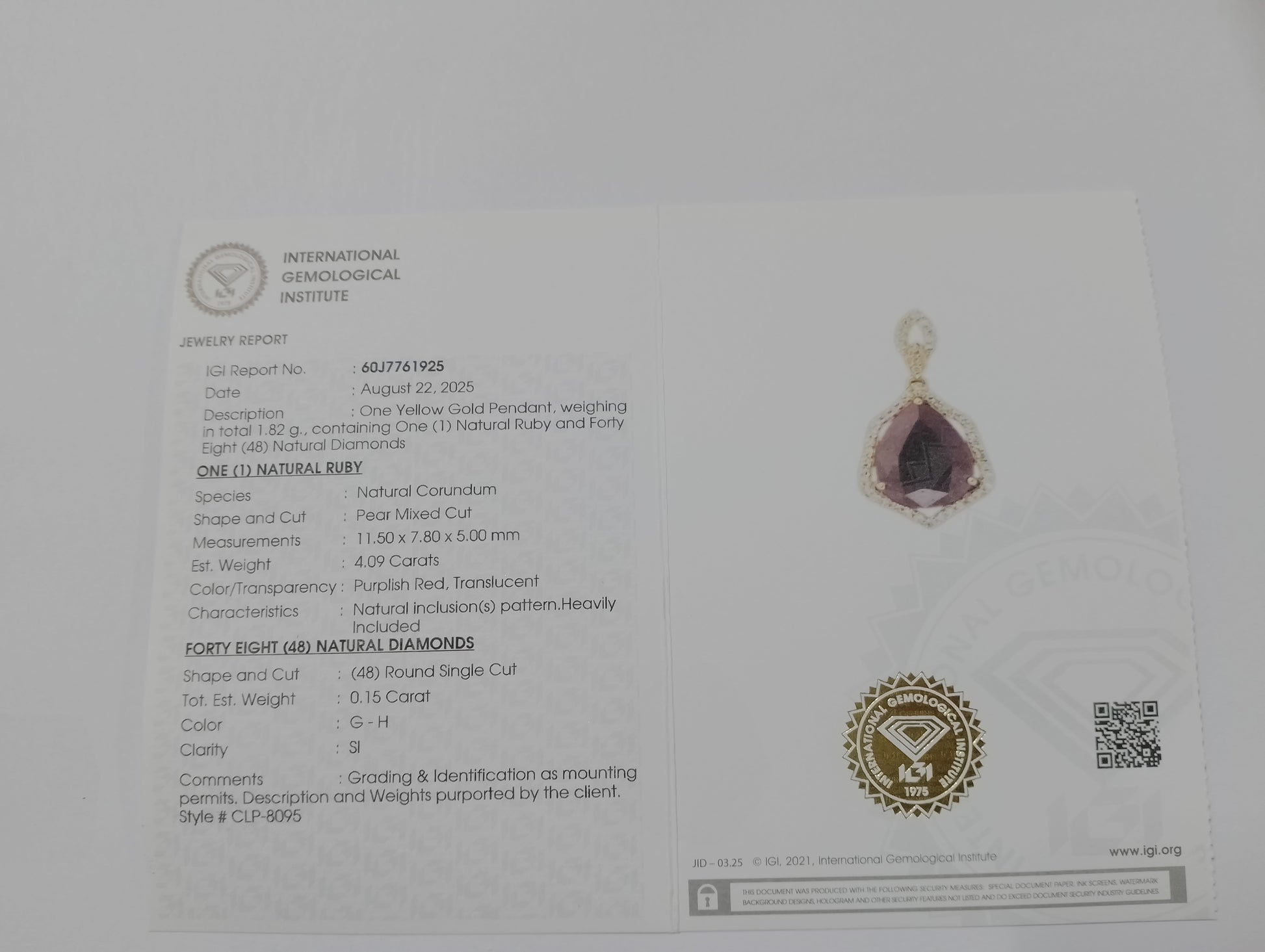 4.24 Ct Pear Mixed Cut Natural Corundum Ruby 14K Gold Pendant