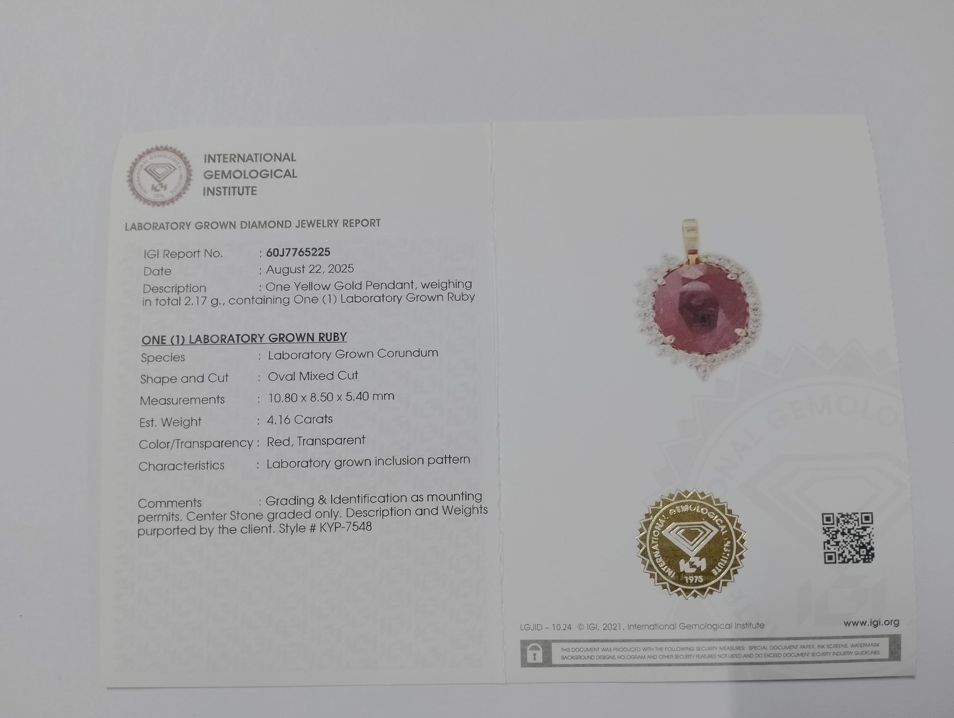 4.46 Total Carat Lab Grown Ruby 14K Gold Pendant