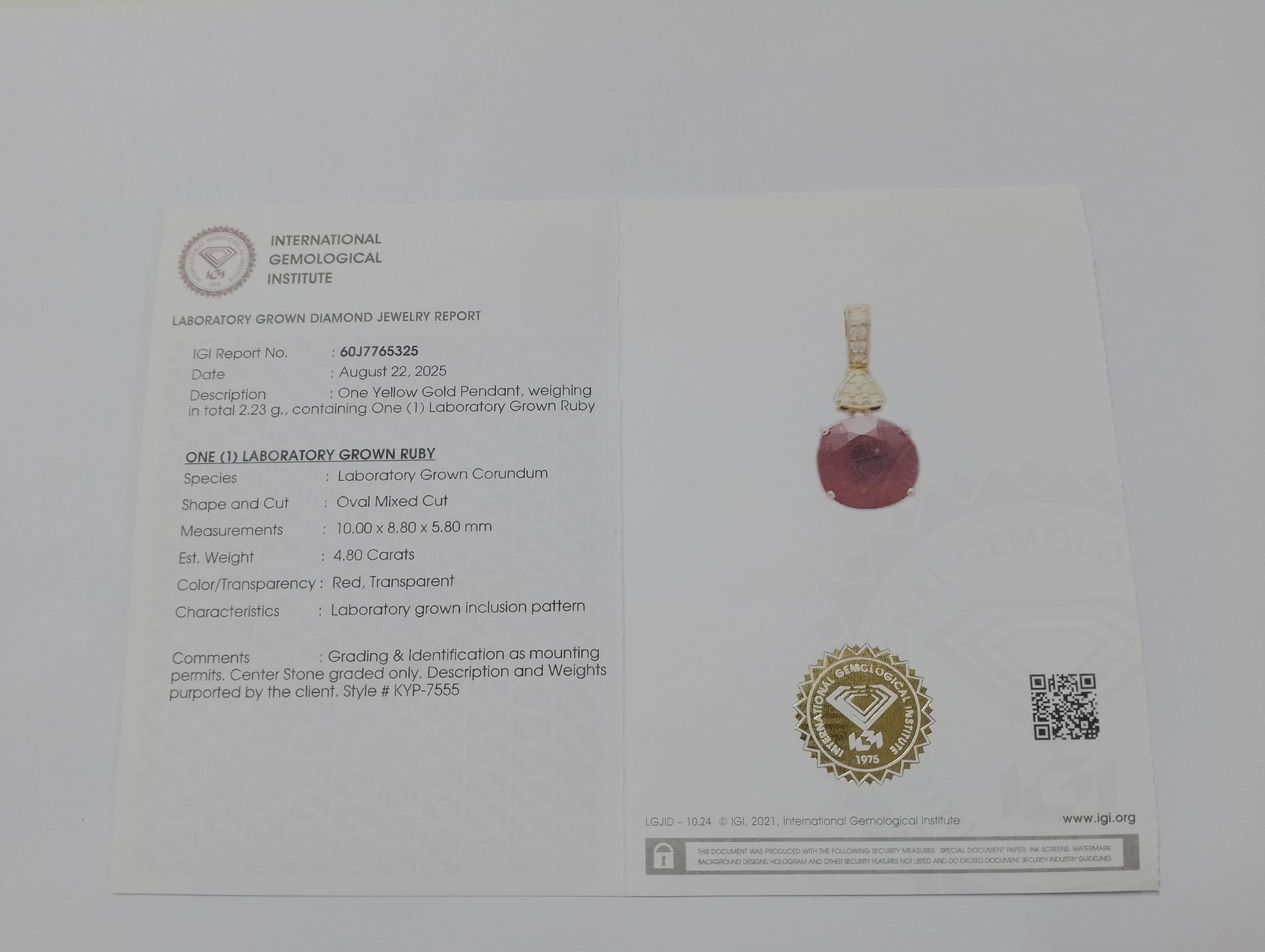 4.88 Total Carat Lab Grown Ruby 14K Gold Pendant