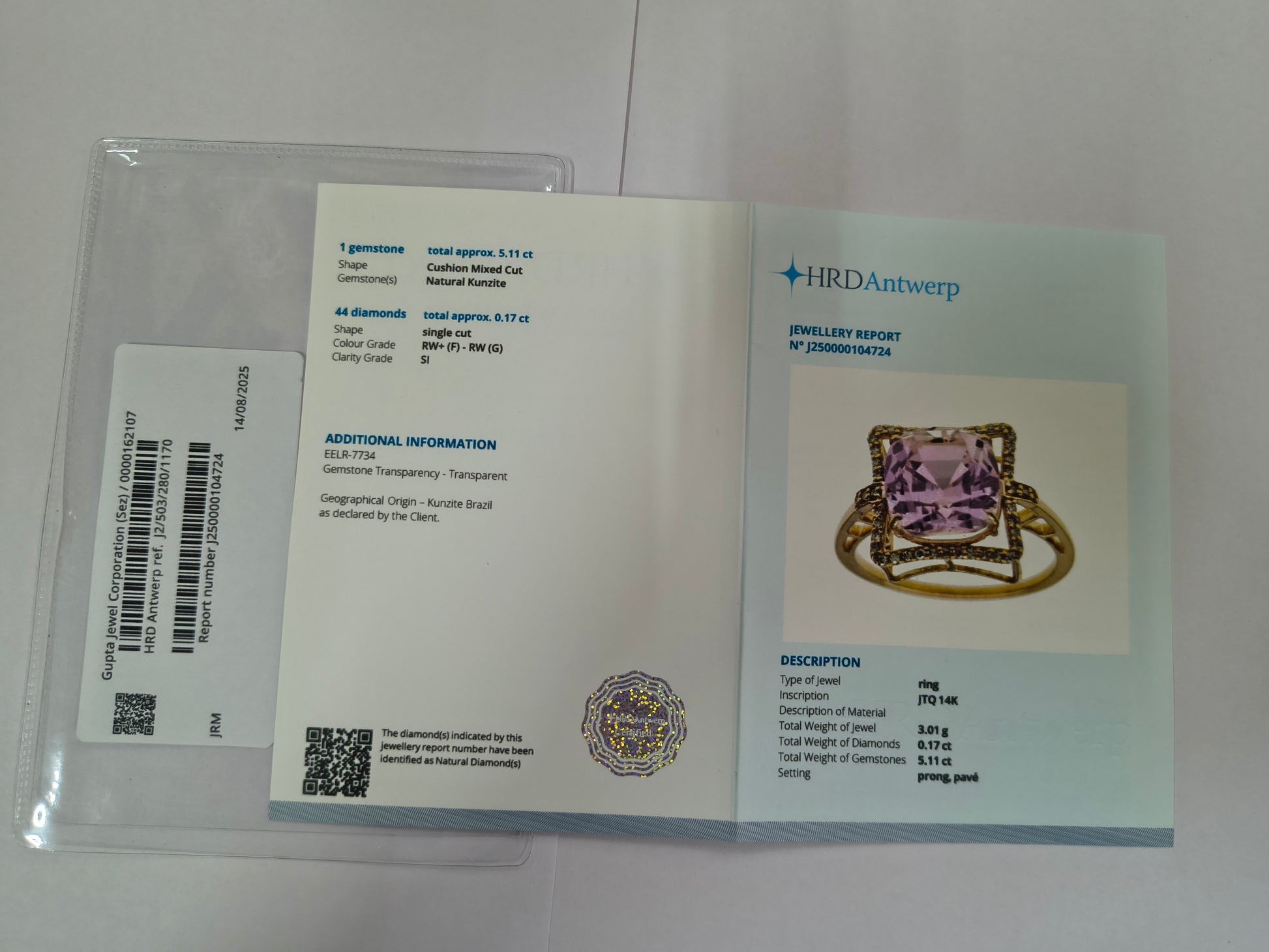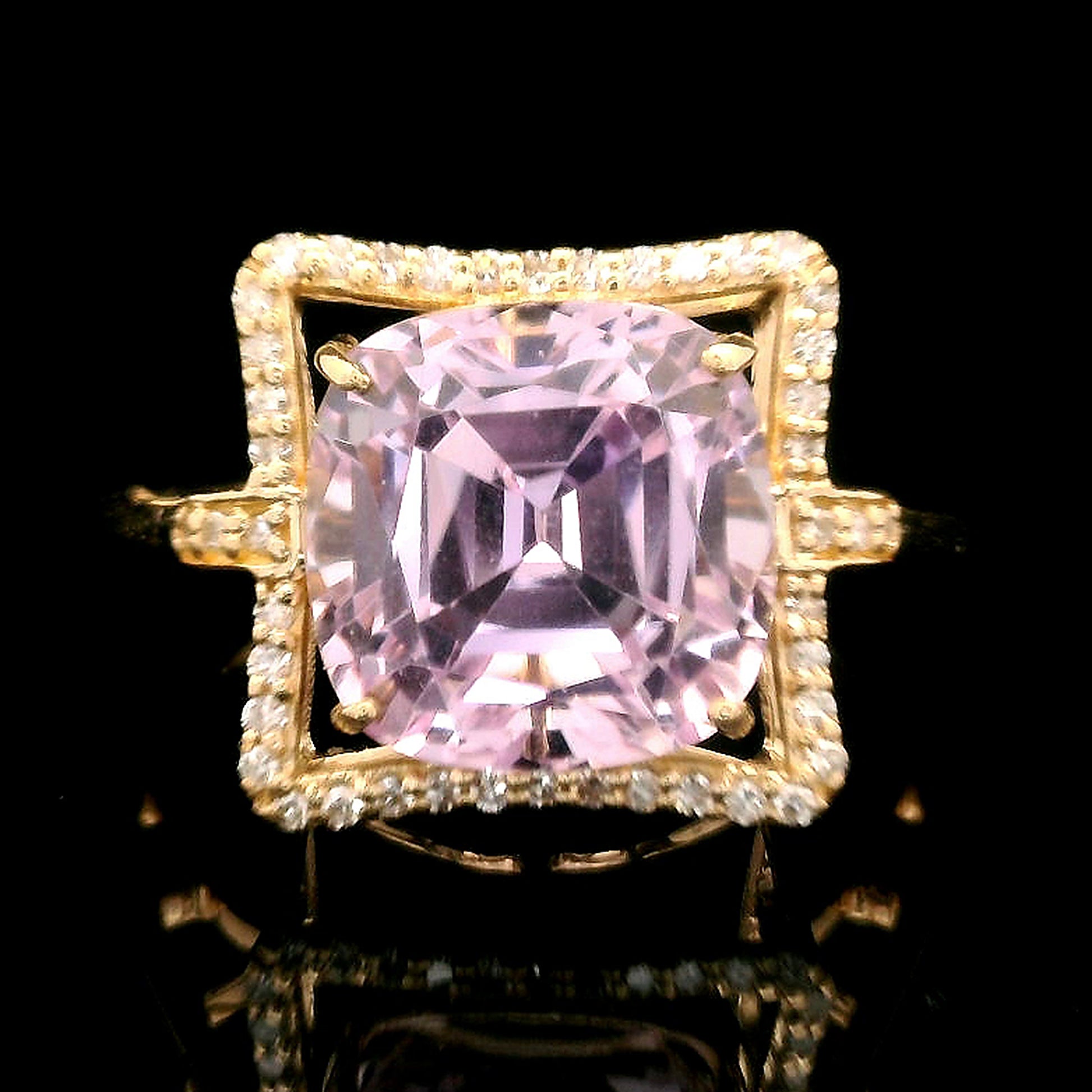 5.28 Ct Cushion Mixed Cut Natural Kunzite 14K Gold Ring