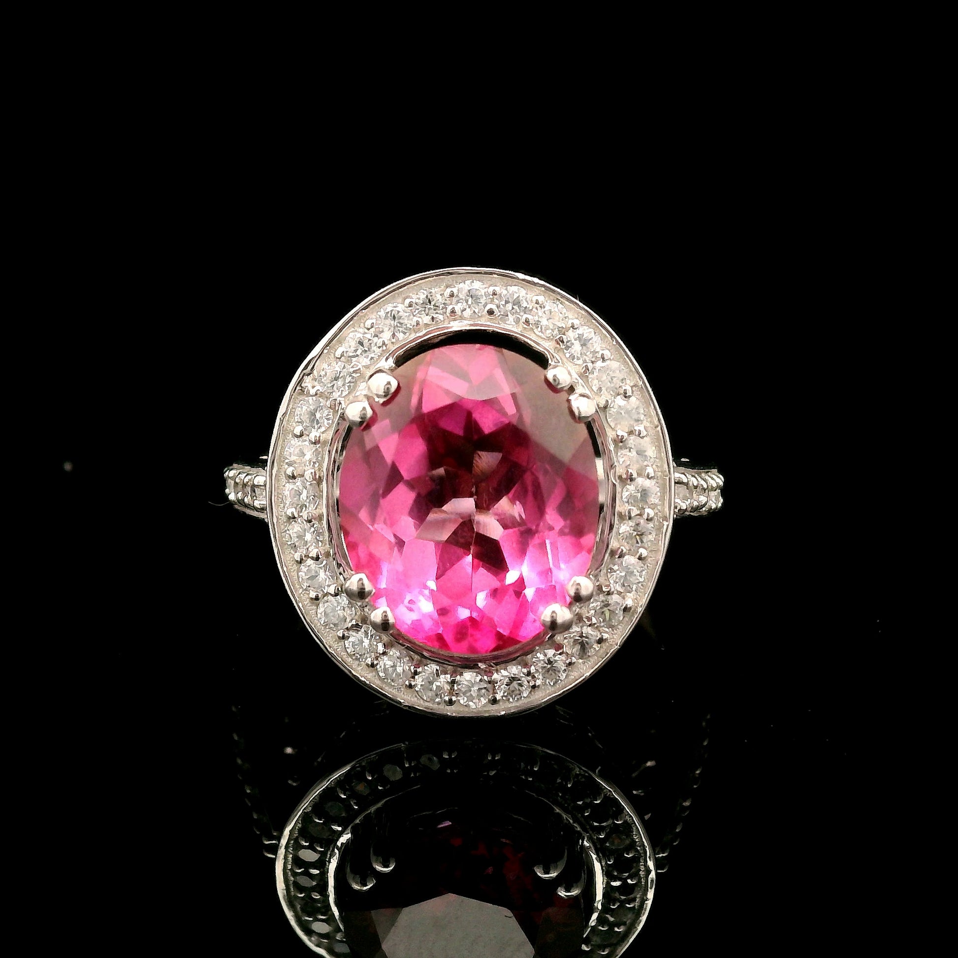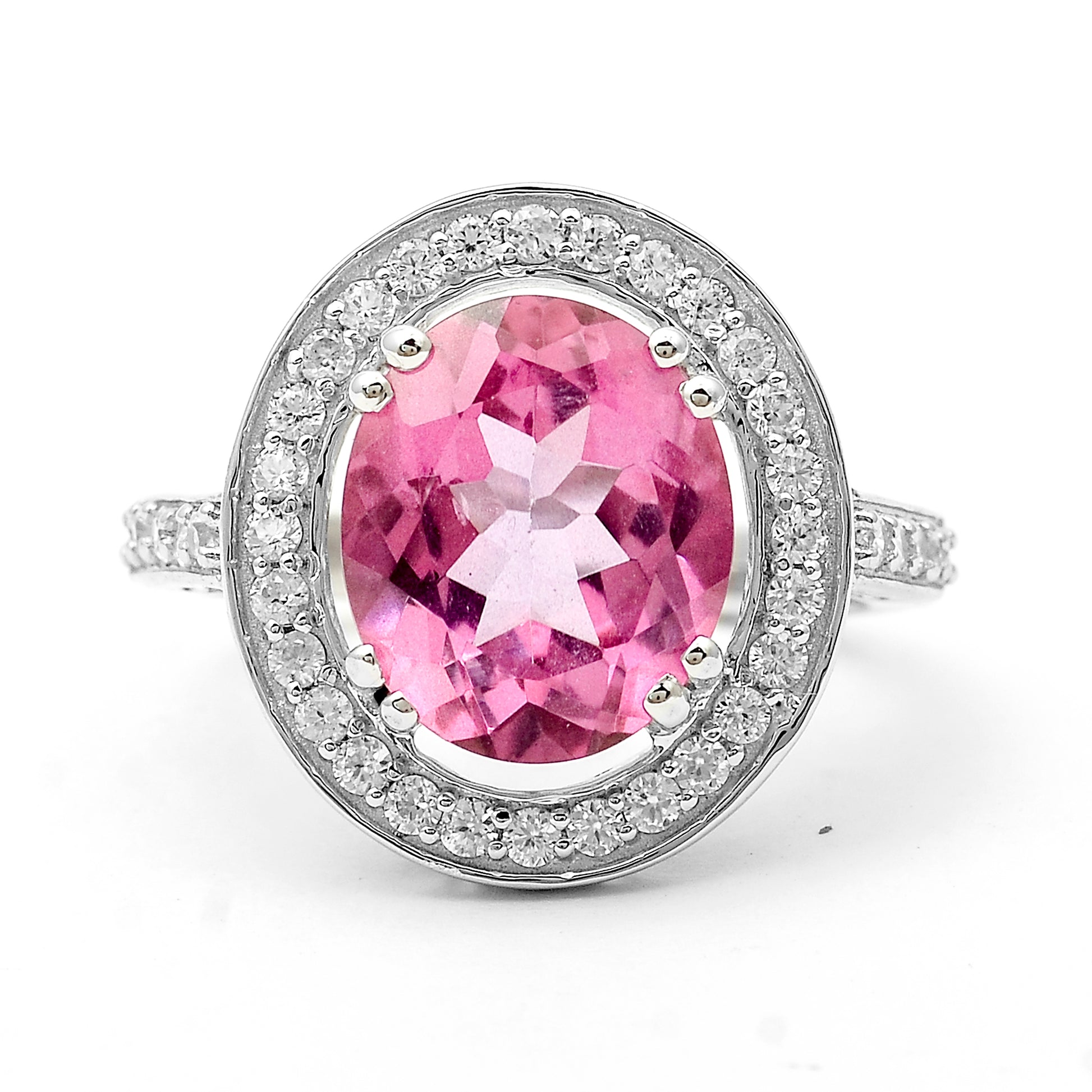 5.72 Ct Oval Pink Topaz, White Zircon 925 Sterling Silver Ring