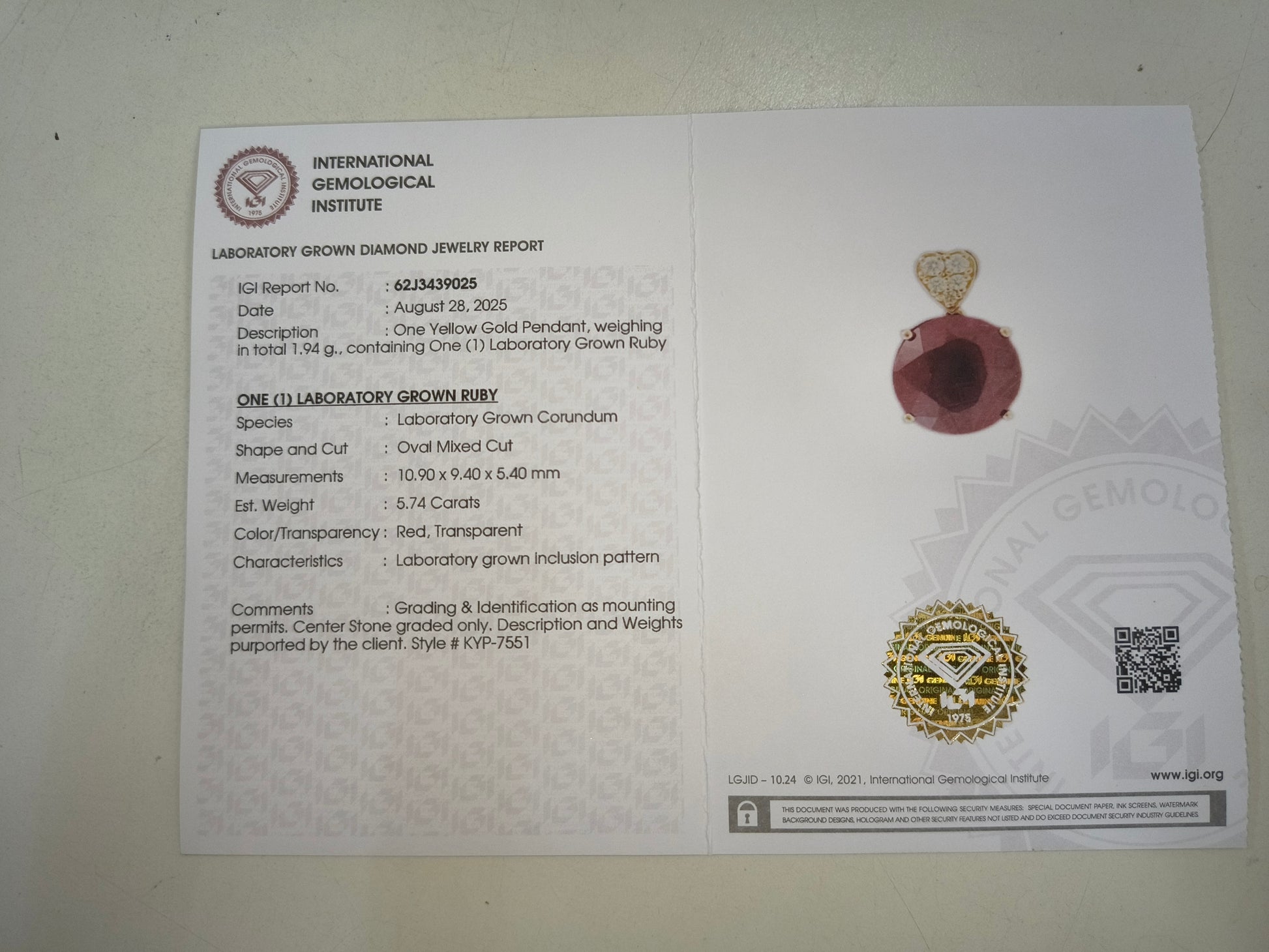 5.84 Total Carat Lab Grown Ruby 14K Gold Pendant