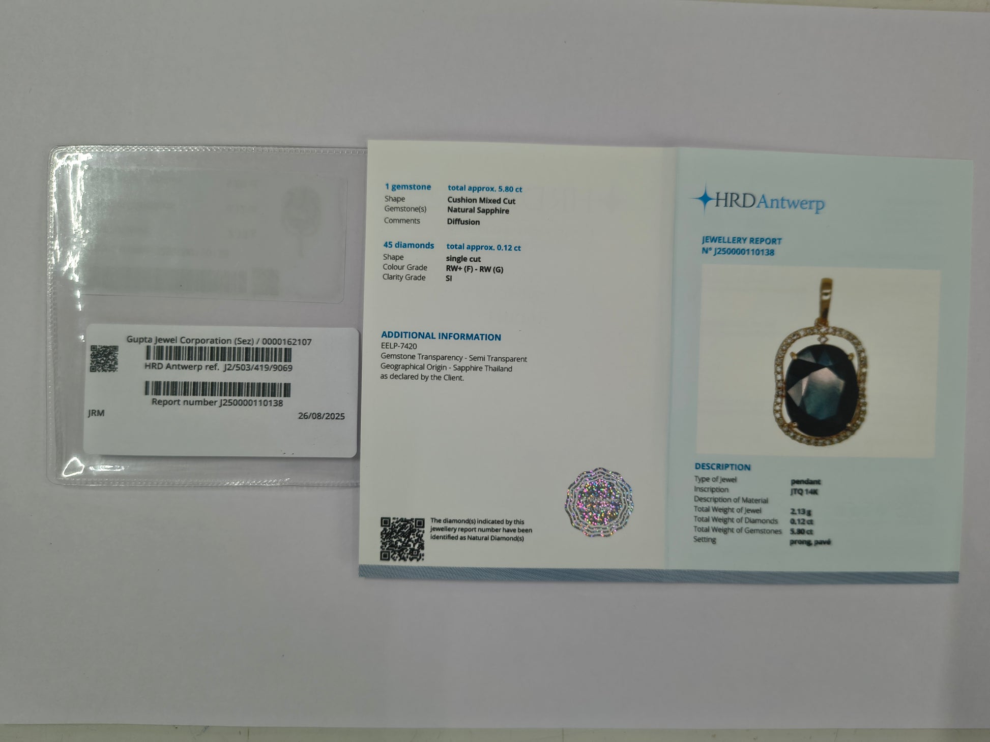 5.92 Ct Cushion Mixed Cut Natural Sapphire 14K Gold Pendant