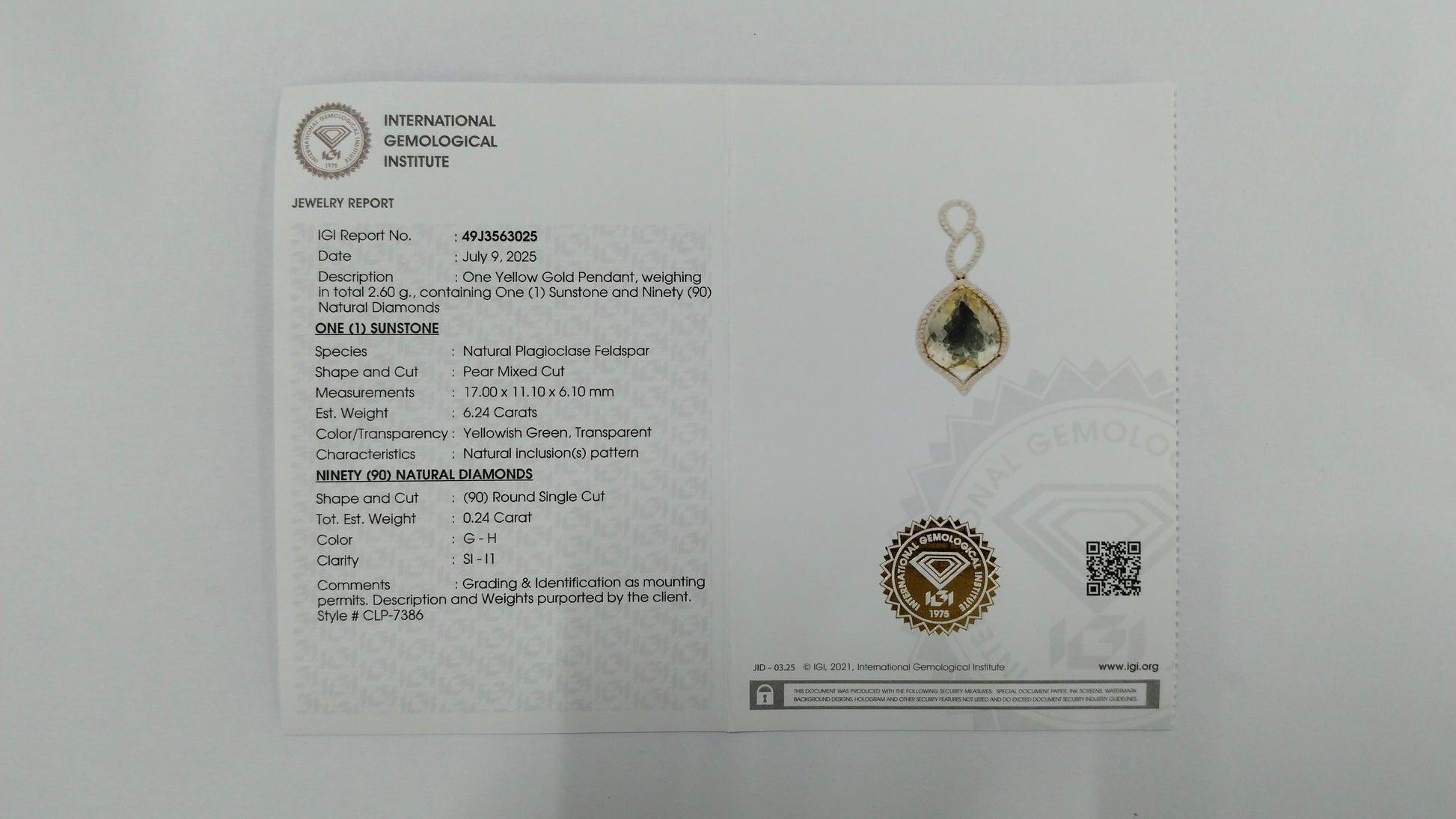 6.48 Ct Pear Mixed Cut Natural Plagioclase Feldspar Sunstone 14K Gold Pendant