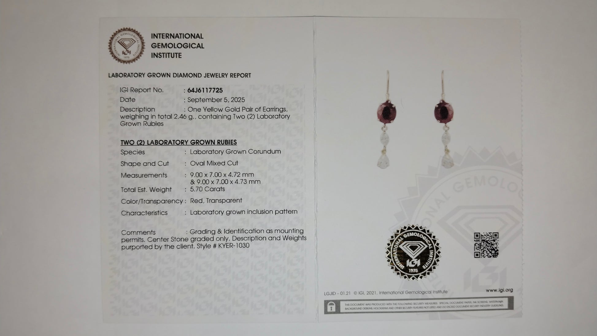 6.85 Total Carat Lab Grown Ruby 14K Gold Earrings