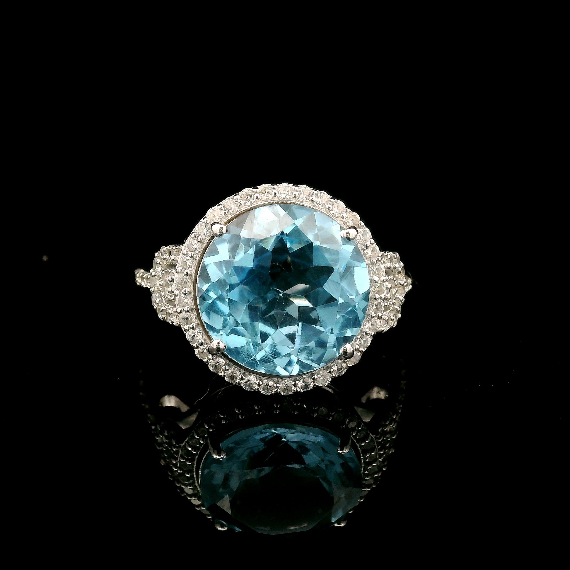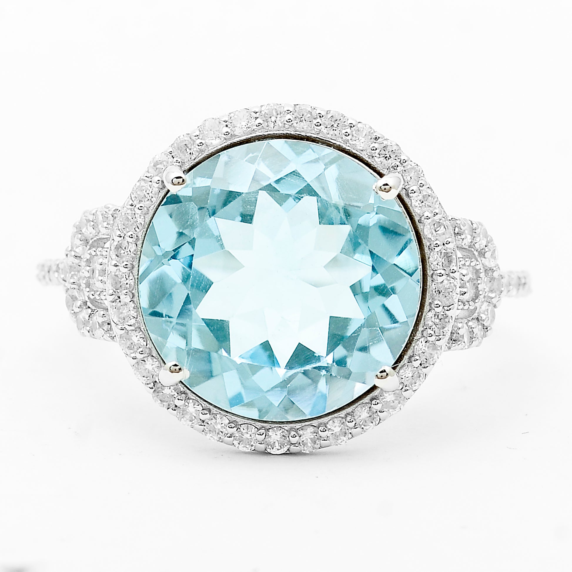 7.35 Ct Round Blue Topaz, White Zircon 925 Sterling Silver Ring