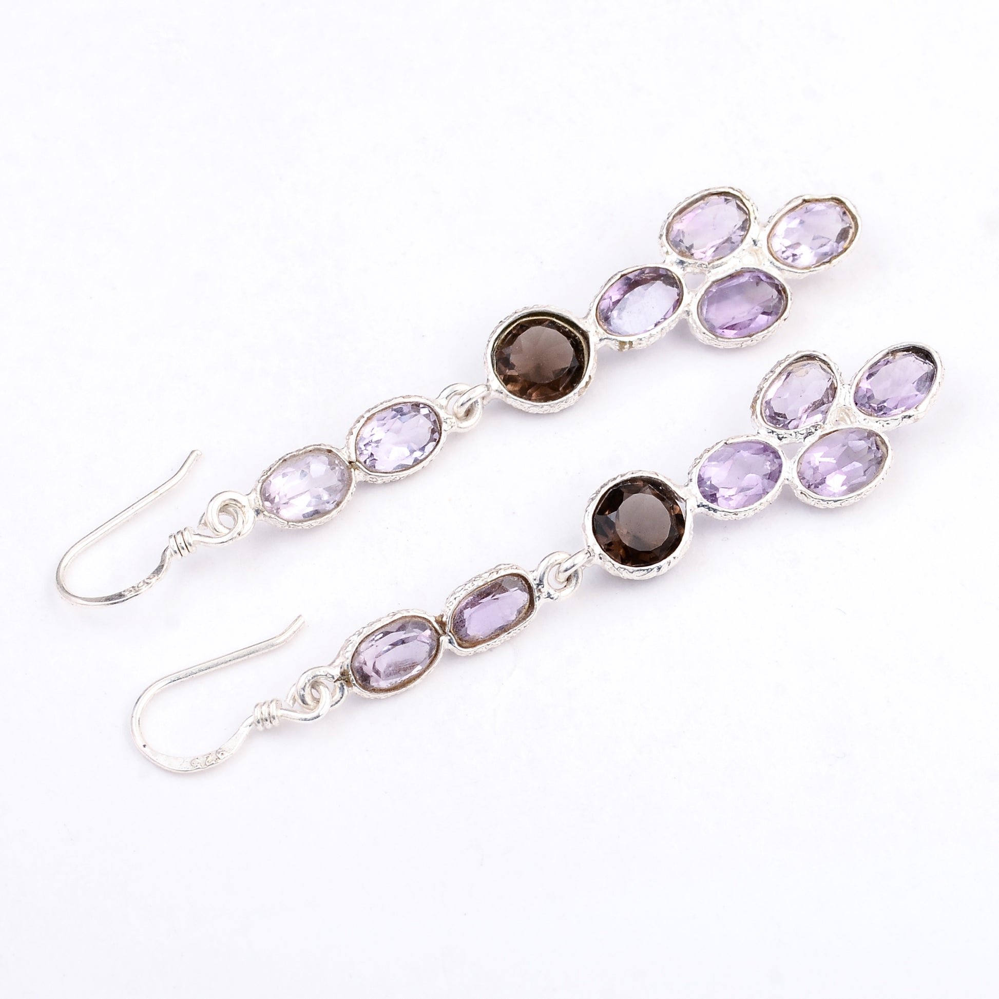 7.40 Ct Smoky Quartz, Amethyst 925 Sterling Silver Earrings