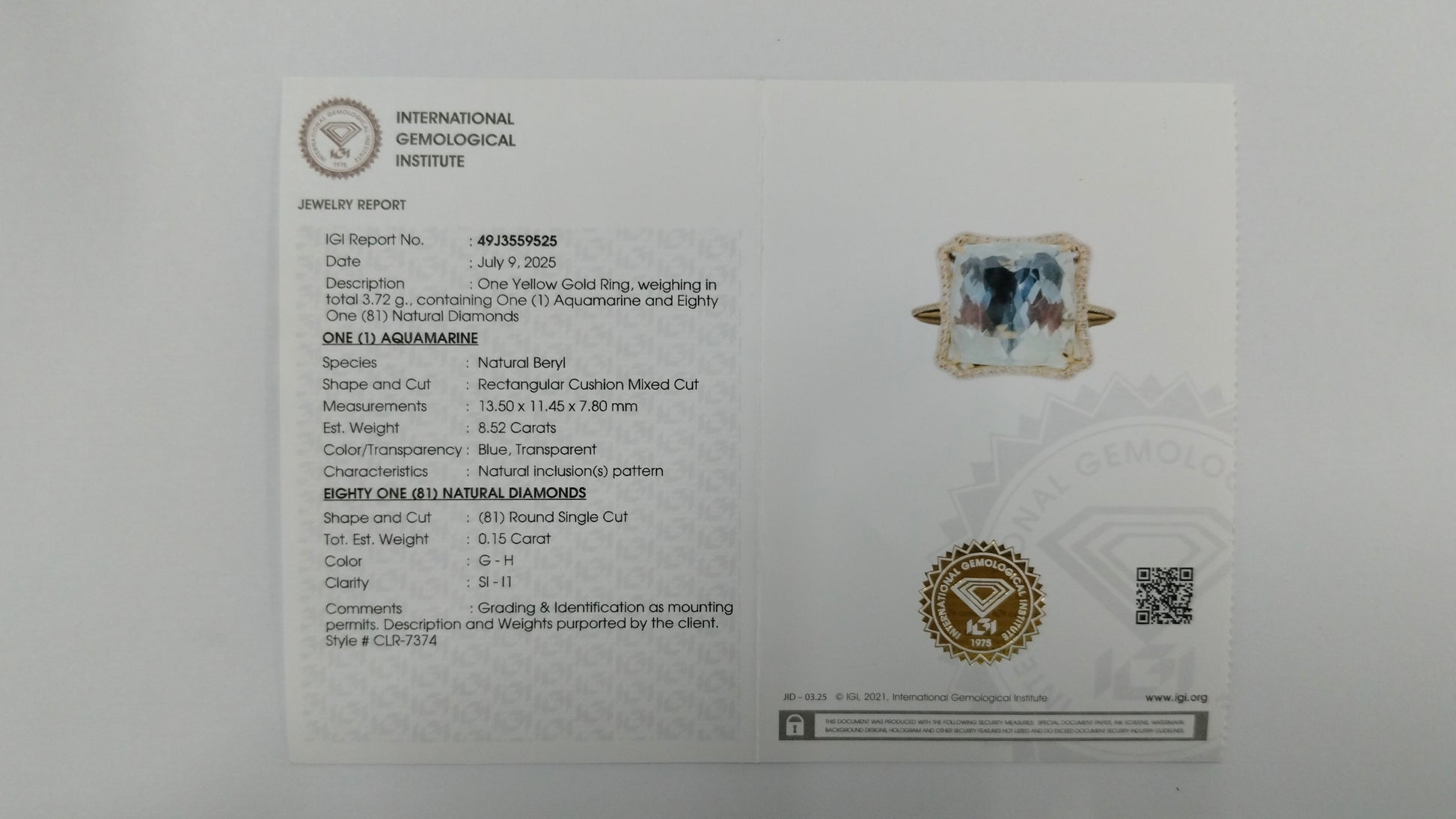 - Lab Name: International Gemological Institute (IGI)