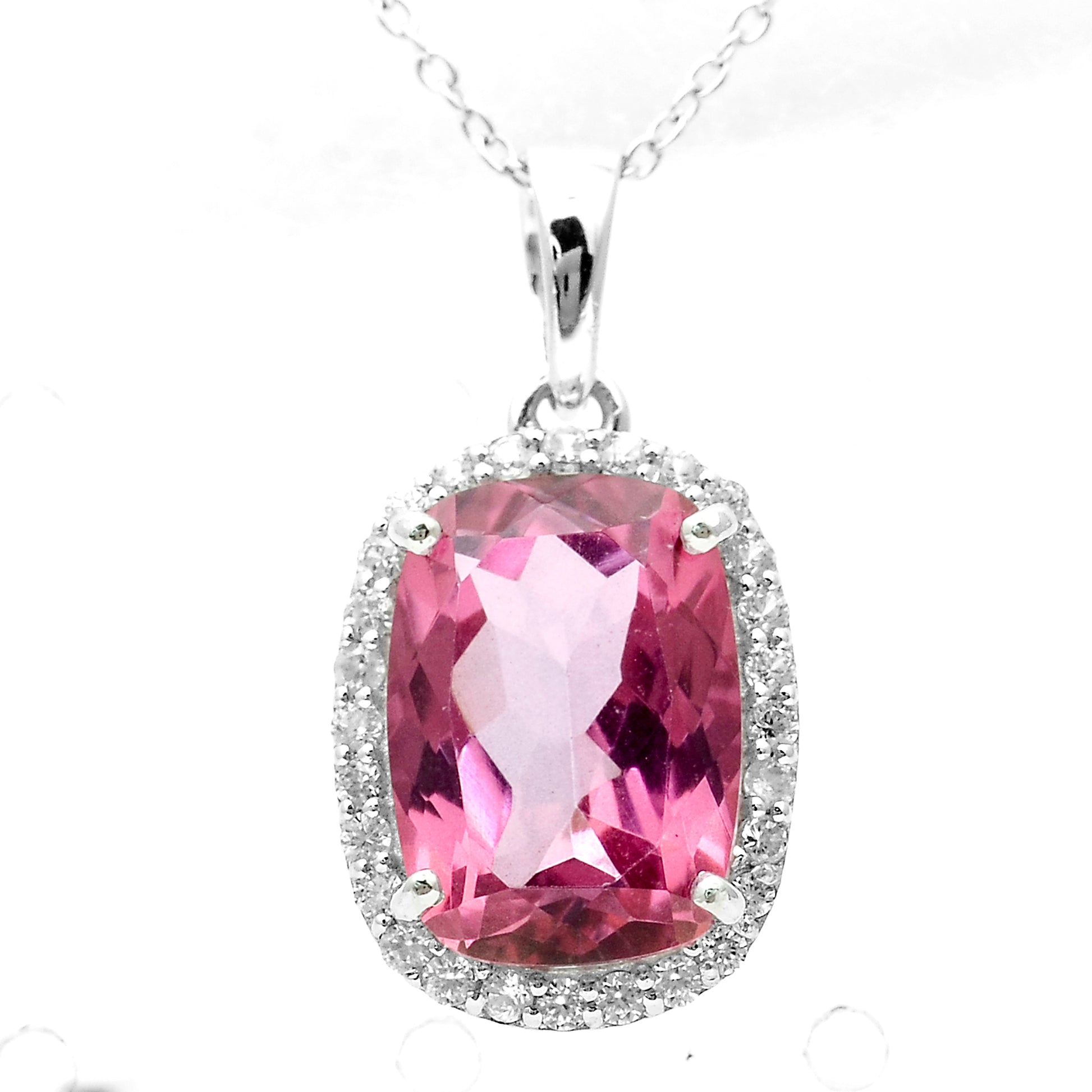 9.58 Ct Cushion Pink Topaz, White Zircon 925 Sterling Silver Pendant